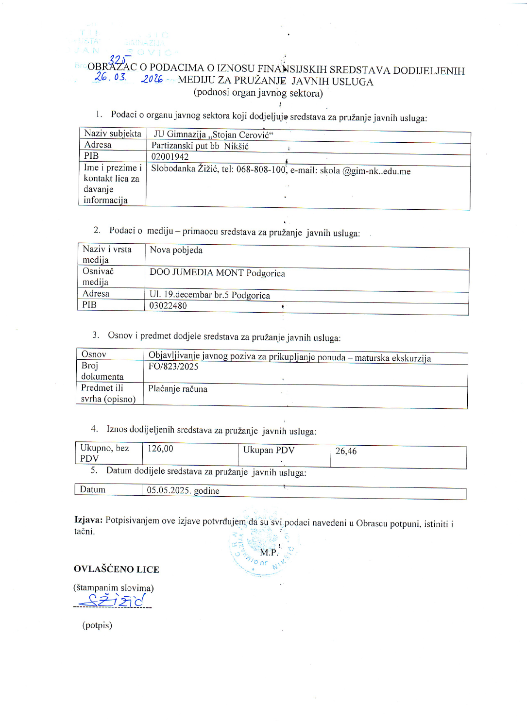 Obrazac o podacima o iznosu finansijskuh sredstava dodijeljenih mediju 27/03/2026 Dokumenta gimnazijank 0 Comments PDF link: Obrazac o podacima o iznosu finansijskuh sredstava dodijeljenih mediju